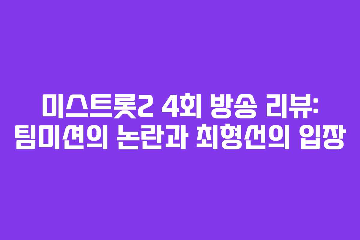 미스트롯2의 4회 방송은 팀미션에서의 불협화음과 그에 따른 논란으로 많은 관심을 받았습니다. 최형선의 입장은 방송의 편집이 얼마나 참가자에게 영향을 미치는지를 잘 보여줍니다. 모든 판단은 시청자에게 달려 있지만, 제작진의 편집이 참가자에게 미치는 영향에 대해 다시 한번 생각해볼 필요가 있습니다.