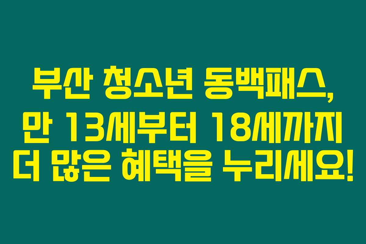 부산 청소년 분들, 대중교통 이용할 때 요금 걱정하고 계시나요? 2024년 7월부터 만 13세부터 18세까지 청소년들이 받을 수 있는 ‘청소년 동백패스’가 시작됩니다. 이제 매달 대중교통 요금을 아끼고 현명하게 이용할 수 있는 기회를 놓치지 마세요!