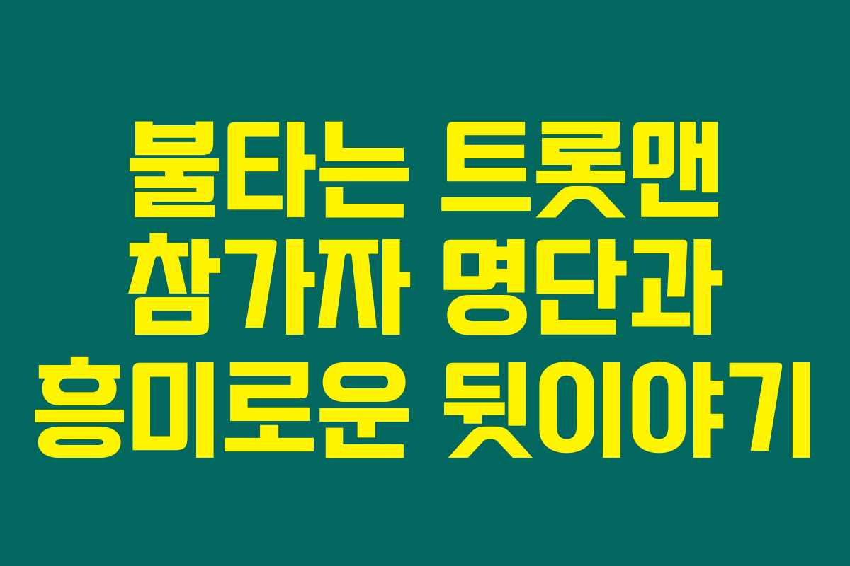 불타는 트롯맨은 2022년 12월 20일 첫 방송을 시작으로 많은 사랑을 받고 있는데요. 이 프로그램은 총 100명의 참가자가 출연하여 치열한 경쟁을 펼치는 트로트 서바이벌 프로그램입니다. 여러분들이 궁금해하실, 이 프로그램의 참가자 명단을 아래에서 확인해보세요!