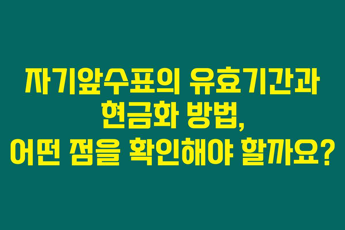 제가 직접 체크해본 바로는, 자기앞수표는 안전하고 편리한 금융 수단이지만, 사용 시 유효기간과 사고조회 등 절차를 정확히 알고 있어야 안전하게 거래할 수 있습니다. 아래를 읽어보시면 자기앞수표의 유효기간 확인 방법과 현금화 및 입금 절차를 이해하는 데 도움이 될 것입니다.