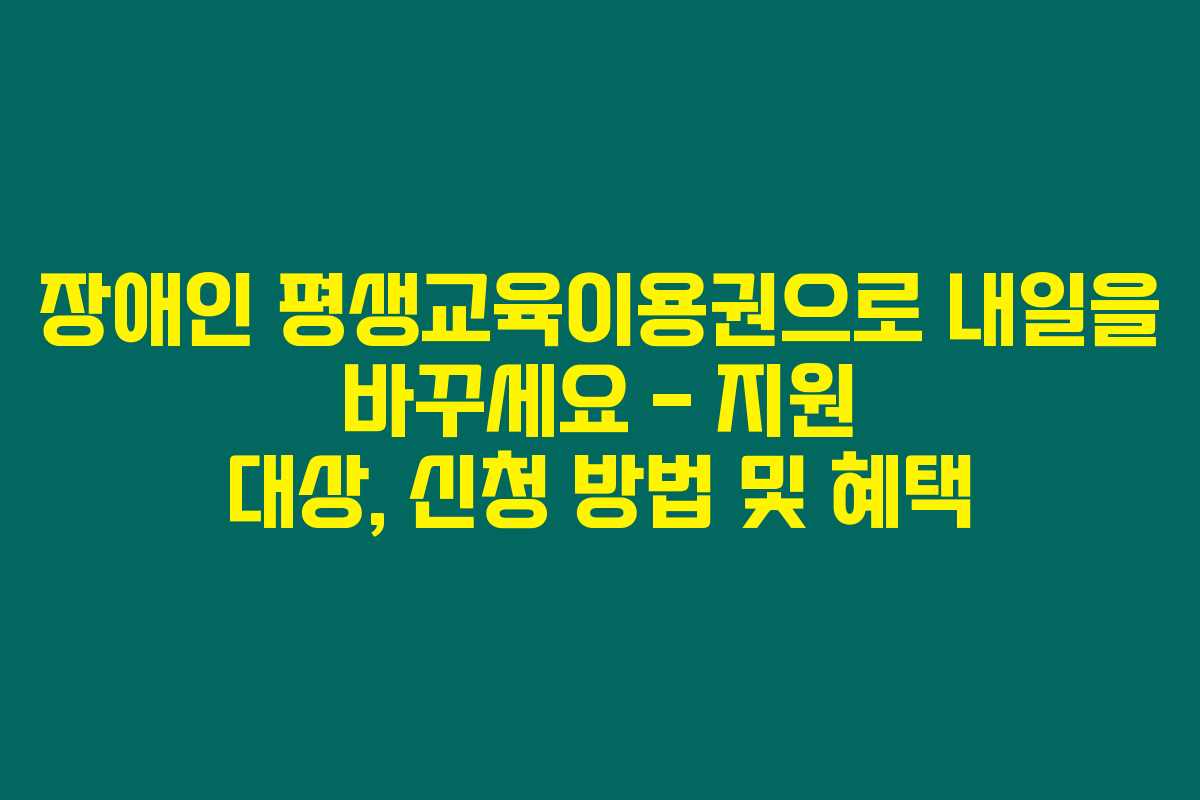 제가 알아본 바로는 장애인 평생교육이용권은 19세 이상의 등록 장애인이 평생교육을 통해 자신의 능력을 개발하고 사회에 적극적으로 참여할 수 있도록 도와주는 제도입니다. 이 지원을 통해 여러분은 다양한 평생교육 수강료와 교육 교재 비용을 부담 없이 이용할 수 있습니다. 아래를 읽어보시면 이 제도의 지원 대상, 신청 방법 및 주요 혜택에 대한 자세한 정보를 확인할 수 있습니다.
