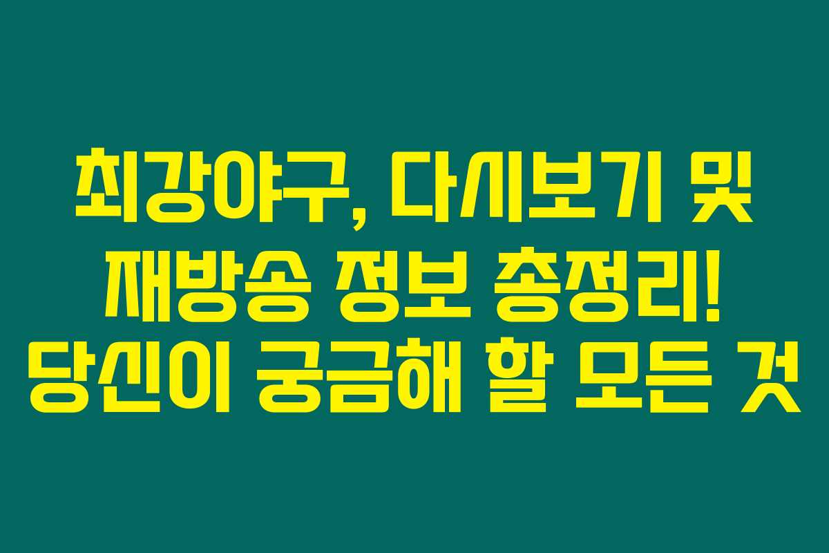 최강야구를 기다리고 있다면 이제 고민할 필요 없어요. ‘재방송’과 ‘다시보기’를 찾는 분들은 늘어나는 데 반해 원하는 정보를 쉽게 찾기 어려운 게 현실이잖아요? 오후 10시 30분에 방송되는 이 스포츠 예능은 그야말로 놓쳐선 안 될 콘텐츠입니다. 아래를 읽어보시면 최강야구의 모든 방송 시간과 재방송 정보, 그리고 출연진까지 자세히 알아볼 수 있으니 절대로 놓치지 마세요!