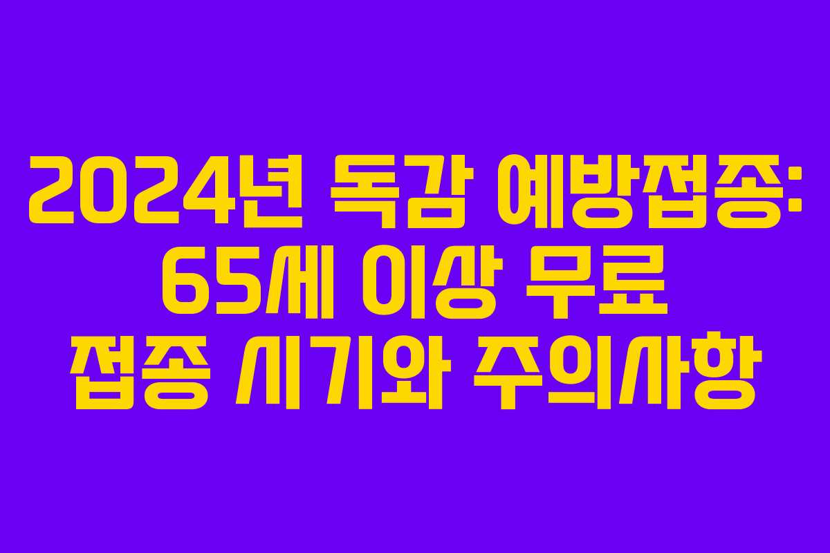 2024년 65세 이상을 위한 무료 독감 예방접종은 2023년 9월 14일부터 시작되어 2024년 4월 30일까지 진행됩니다. 이 기간 동안 의료기관을 방문하면 무료로 접종을 받을 수 있으며, 접종 전에 의사와 상담하여 가능한지 확인하는 것이 좋습니다.